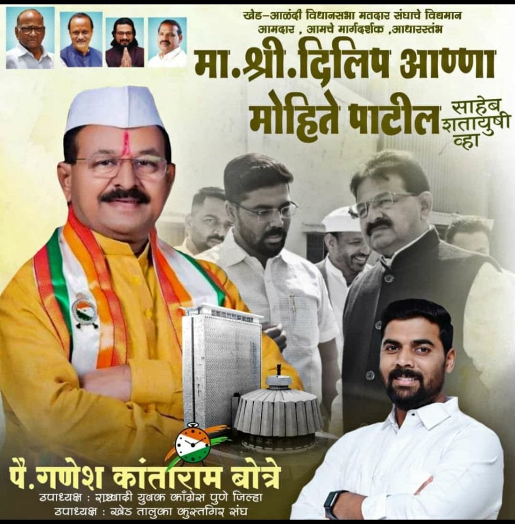 खेड तालुक्याचे लोकप्रिय कार्यसम्राट आमदार मा. दिलीपशेठ मोहिते पाटील यांना वाढदिवसाच्या हार्दिक शुभेच्छा…💐💐💐 ● शुभेच्छुक : श्री. गणेशशेठ बोत्रे ( उद्योजक ) ● उपाध्यक्ष : पुणे जिल्हा राष्ट्रवादी युवक काँग्रेस ● उपाध्यक्ष : खेड तालुका कुस्तीगीर संघ ● गणेश बोत्रे युथ फाऊंडेशन