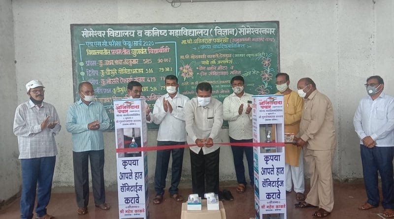 सोमेश्वर विद्यालय स्कूल कमिटी अध्यक्ष महेश काकडे यांच्या स्वखर्चातून विद्यालयास सॅनिटायझर मशीन व थर्मल मीटर भेट
