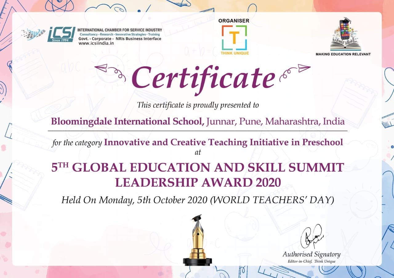 शैक्षणिक वर्ष २०१९-२० मध्ये मुलांचा अवघ्या चार वर्षाचा वयापासूनच शैक्षणिकच नव्हे तर मुलांचा सर्वांगीण विकास व्हायला हवा हा वसा घेऊन काही नाविन्यपूर्ण उपक्रम जसे कम्युनिकेटीव लैंग्वेज प्रोग्रॅम, सर्कल टाइम, फॅमिली सपोर्ट बिल्डींग अॅक्टिविटीज, कल्चरल अॅक्टिविटी, मुलांचा गरजेप्रमाणे व अभ्यासक्रमानुसार पुस्तकांचे प्रकाशन इत्यादी उपक्रम प्राचार्या उषा मूर्ती यांच्या मार्गदर्शनाखाली शाळेत सुरू करण्यात आले. या माध्यमातून मुलांच्या सुप्त गुणांना वाव देण्यात आला. या सर्व उपक्रमांचे सादरीकरण प्राचार्या उषा मॅडम यांनी विविध व्हिडिओ व प्रेझेंटेशन द्वारे जगासमोर केले. ज्याचे भरभरून कौतुक करण्यात आले व ब्लूमिंगडेल प्री स्कूल ला बेस्ट स्कूल इन इनोव्हेटिव्ह अँड क्रिएटिव्ह टेक्निक इनेटिएटीव्ह पुरस्काराने सन्मानित करण्यात आले.