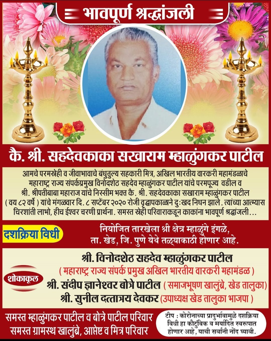 खेडपिंपरी चिचंवडपुणे जिल्हापुणे शहर विभागभावपूर्ण श्रद्धांजली/पुण्यस्मरणमहाराष्ट्रविशेष भावपूर्ण श्रद्धांजली : कै. श्री. सहदेवकाका सखाराम म्हाळुंगकर पाटील September 14, 2020 MahaBulletin Team भावपूर्ण श्रद्धांजली : कै. श्री. सहदेवकाका सखाराम म्हाळुंगकर पाटील