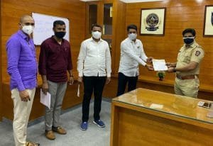 म्हाळुंगे पोलीस चौकीचे पोलीस निरीक्षक अरविंद पवार यांना गावबंदीचे पत्र देताना वासुली, भांबोलीचे सरपंच व पोलीस पाटील