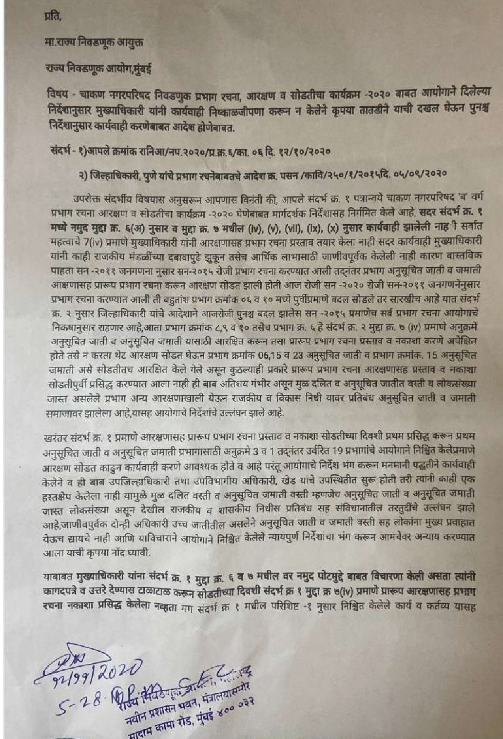 त्यात राज्य निवडणूक आयुक्त यांना चाकण नगरपरिषद निवडणुक प्रभाग रचना, आरक्षण व सोडतीचा कार्यक्रम -२०२० बाबत आयोगाने दिलेल्या निर्देशानुसार मुख्याधिकारी यांनी कार्यवाही निष्काळजीपणा करून न केलेने कृपया तातडीने याची दखल घेऊन पुनश्च निर्देशानुसार कार्यवाही करणेबाबत आदेश होणेबाबत विनंती केली आहे.