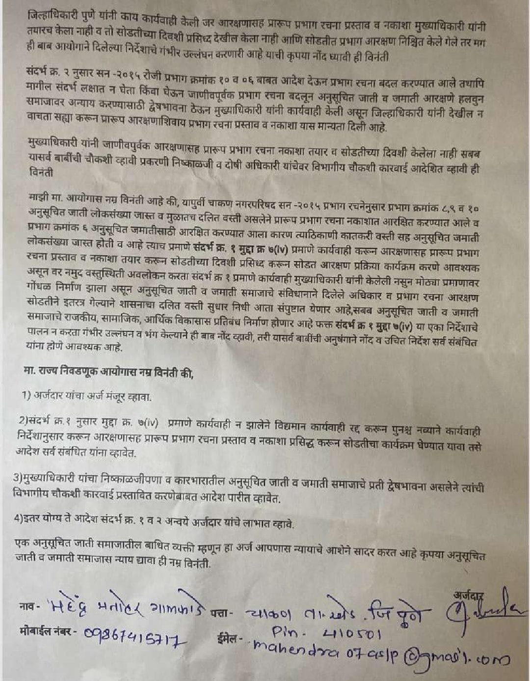 आयोगाचे पत्र रानिआ/नप.२०२०/प्र.क्र.६/का. ०६ दि. १२/१०/२०२० व जिल्हाधिकारी, पुणे यांचे प्रभाग रचनेबाबतचे आदेश क्र. पसन /कावि/२५०/१/२०१५ दि ०५/०९/२०१५ पत्राचे संदर्भाने अनुसरून चाकण नगरपरिषद ‘ब’ वर्ग प्रभाग रचना आरक्षण व सोडतीचा कार्यक्रम -२०२० घेणेबाबत मार्गदर्शक निर्देशासह निर्गमित केले आहे. सदर संदर्भ क्र. १ मध्ये नमुद मुद्दा क्र. ६(अ) नुसार व मुद्दा क्र. ७ मधील (iv), (v), (vii), (ix), (x) नुसार कार्यवाही झालेली नाही. सर्वात महत्वाचे 7(iv) प्रमाणे मुख्याधिकारी यांनी आरक्षणासह प्रभाग रचना प्रस्ताव तयार केला नाही. सदर कार्यवाही मुख्याधिकारी यांनी काही राजकीय मंडळींच्या दबावापुढे झुकून जाणीवपूर्वक केलेली नाही.