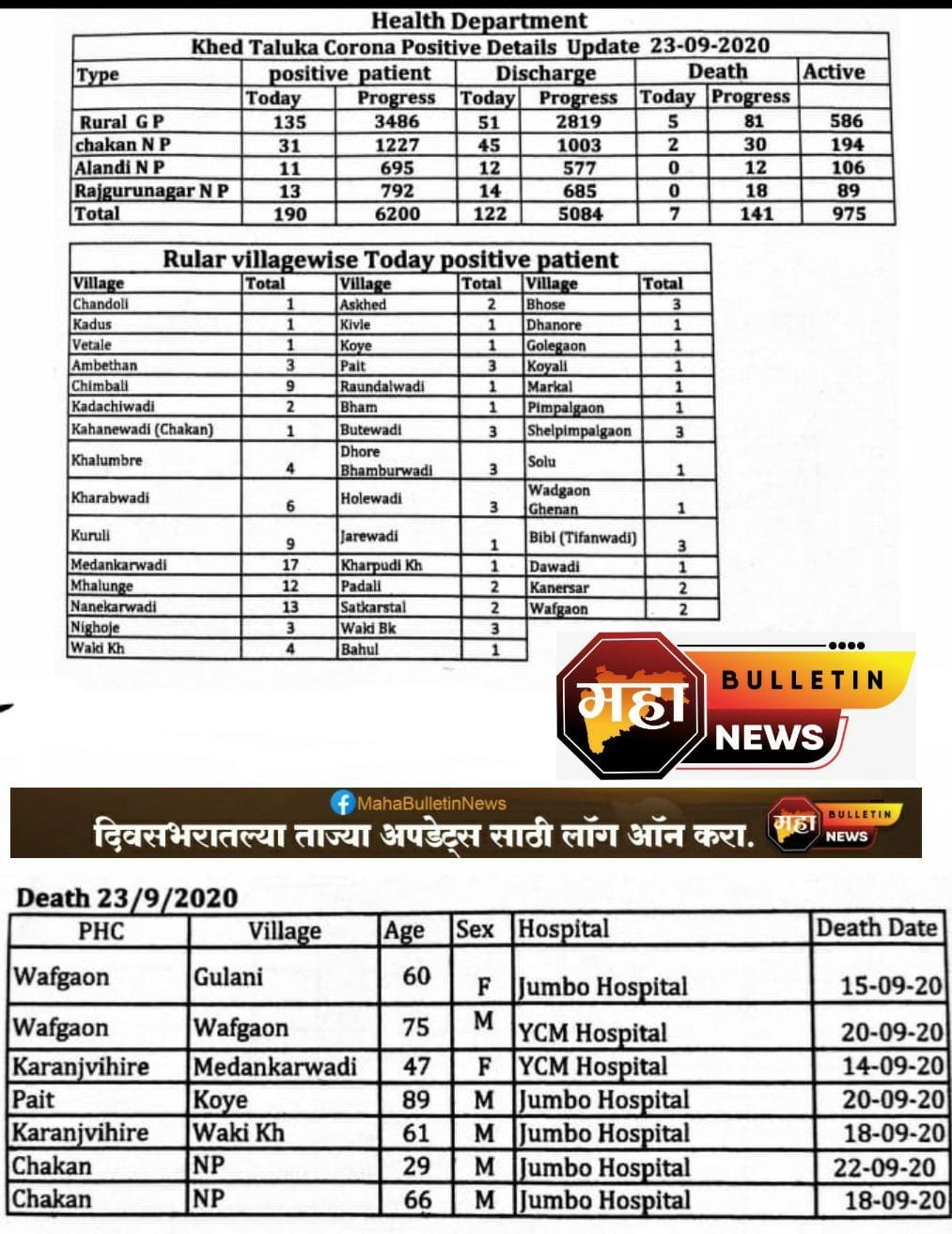 कोरोना अपडेट : खेड तालुका ( दि. २३ सप्टेंबर २०२० ) आज खेड तालुक्यात आज १९० नवीन कोरोना रुग्णांची वाढ, सात रुग्णांचा मृत्यू