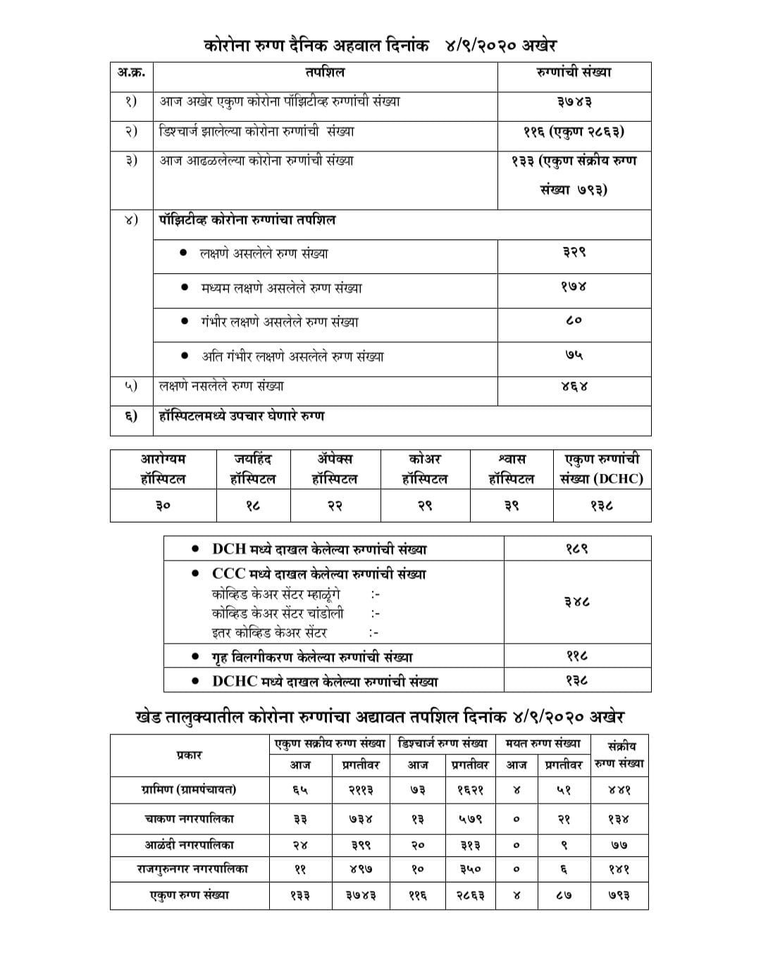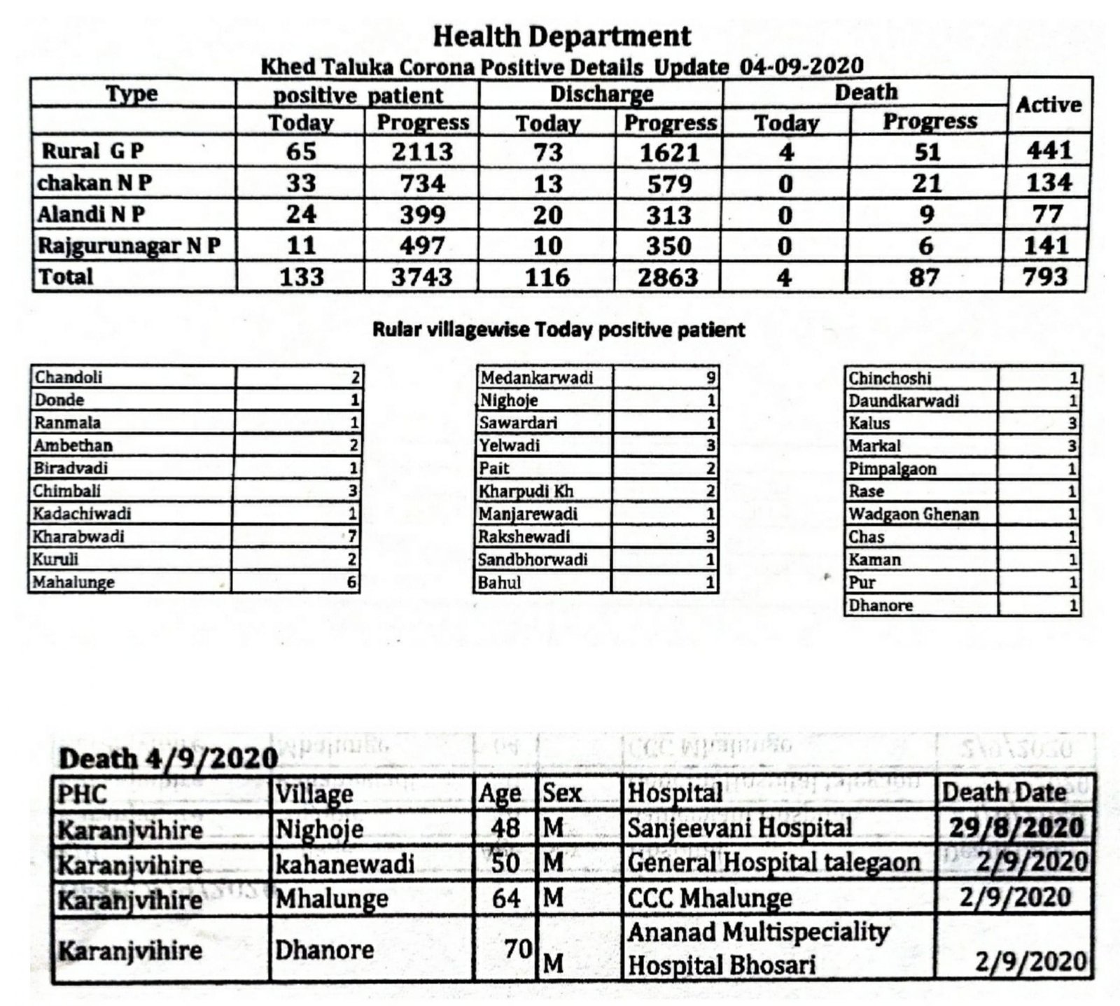 कोरोना अपडेट : खेड तालुका ( दि. ४ सप्टेंबर २०२० ) खेड तालुक्यात आज १३३ नवीन कोरोना रुग्णांची वाढ, चार जणांचा मृत्यू