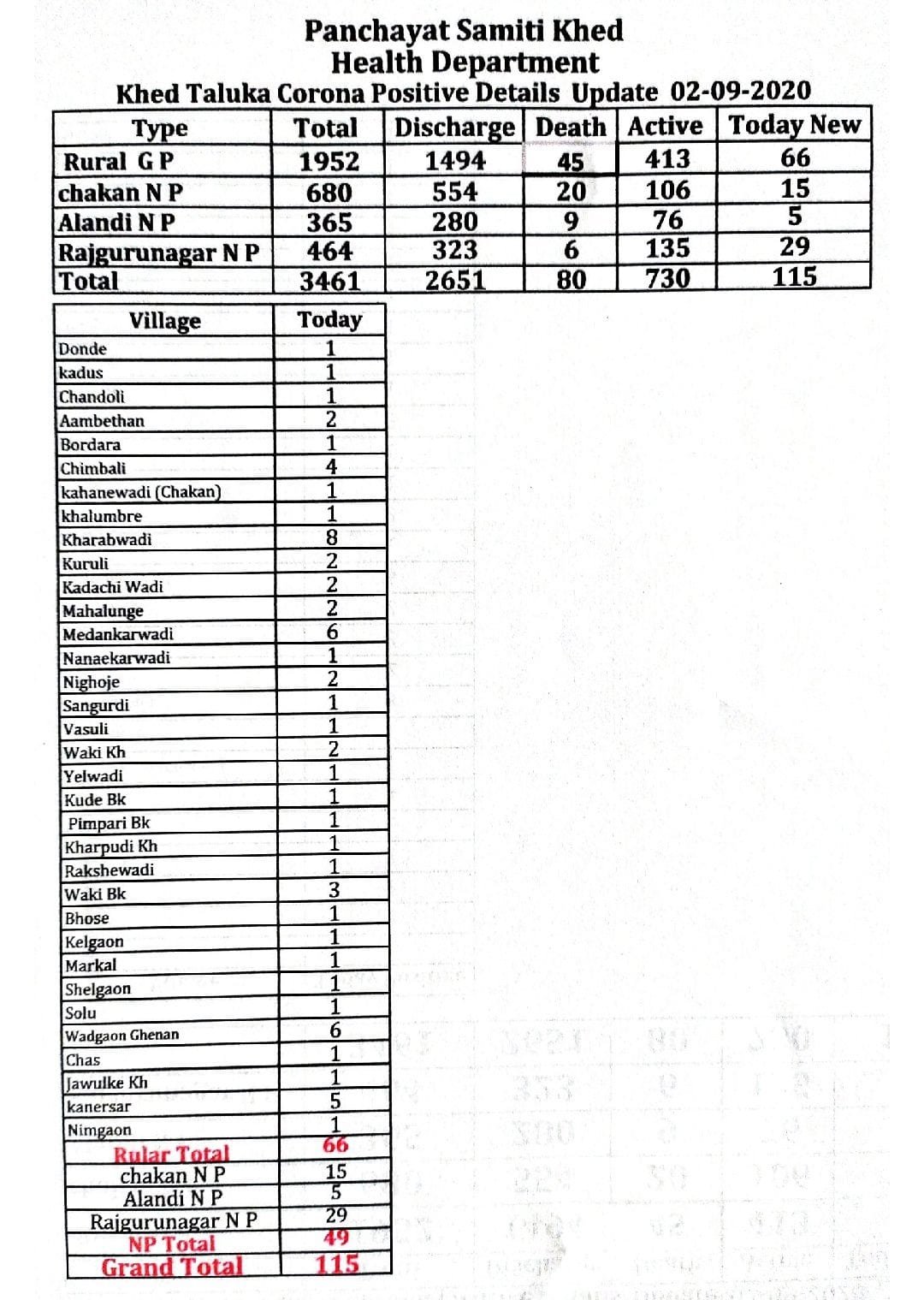 कोरोना अपडेट : खेड तालुका ( दि. २ सप्टेंबर २०२० ) – राजगुरूनगरला सर्वाधिक २९ रुग्ण, कडाचीवाडी मधील एकाचा मृत्यू