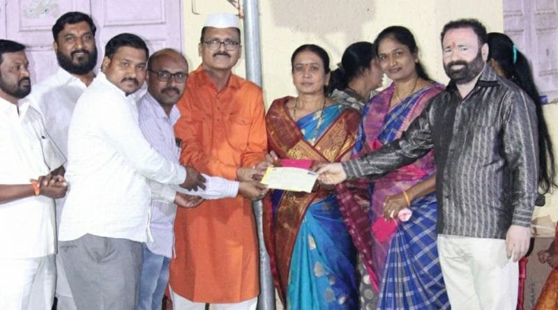 चाकण : हळदी-कुंकू समारंभाचे औचित्य साधून चाकण नगरपरिषदेच्या प्रभाग क्र. २० मधील देशमुख आळी येथे सौ. वैशालीताई मालोजीराव देशमुख व त्यांच्या कुटूंबियांकडून श्रीराम जन्मभूमी तिर्थक्षेत्र विकासासाठी १० हजार ५५५ रुपये रोख देणगी प्रदान करण्यात आली. ही देणगी राम मंदिर निधी संकलन अभियानचे चाकण येथील चक्रेश्वर मंडलचे कोषाध्यक्ष तुषार खळदकर व RSS चे कार्यकर्ते किशोर भुजबळ यांनी स्वीकारली. राम मंदिर निधी संकलनासाठी खेड तालुक्यात 5 मंडल करण्यात आले असून चाकण येथील चक्रेश्वर मंडलमध्ये 33 गावांचा समावेश आहे.