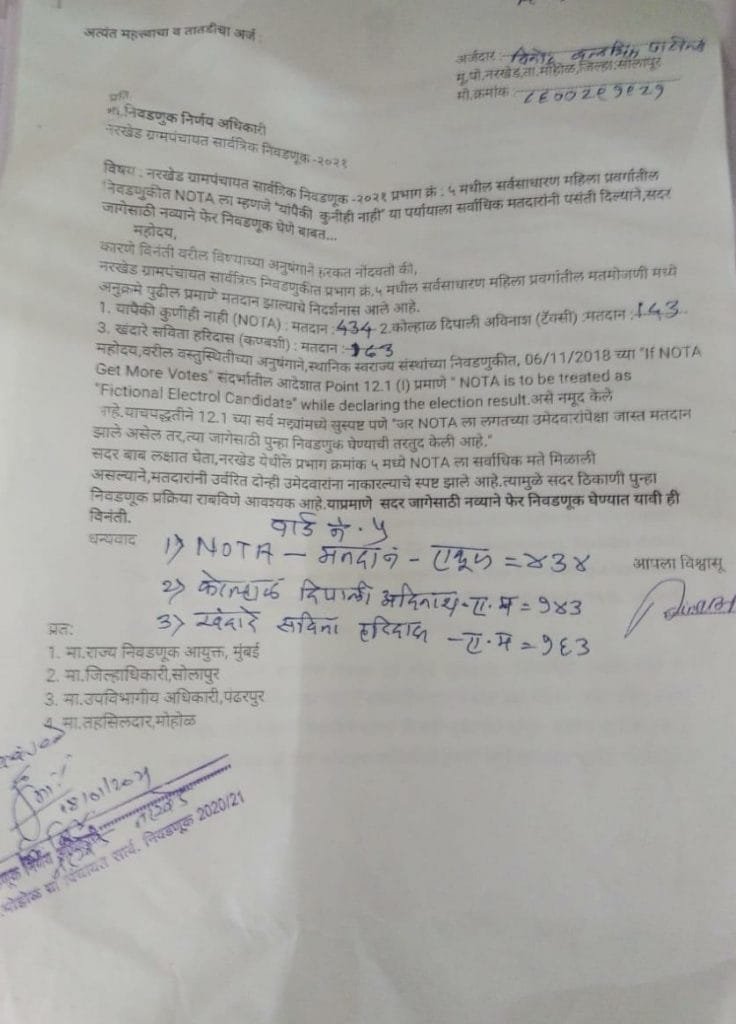 नरखेड ग्रामपंचायत निवडणुकीत प्रभाग क्रमांक ५ मध्ये सर्वसाधारण महिला प्रवर्गातील उमेश पाटील यांच्या पार्टीकडून उमेदवारी अर्ज भरलेल्या उमेदवार सौ. वृषाली पाटील यांचा उमेदवारी अर्ज संगणकीय चुकीमुळे बाद झाला होता. त्यामुळे त्यांच्या विरोधात उभे असलेल्या दिपाली कोल्हाळ (१४३ मतदान) व सविता खंदारे (१६३ मतदान) या दोन उमेदवारांपैकी एकालाही निवडून न देता सुज्ञ मतदारांनी “नोटा” ला ४३४ मतदान करून, ग्रामीण भागात देखील मतदार किती जागृक असू शकतो, याचे संबंध देशासमोर उदाहरण घालून दिले. सदर प्रभागामधून “नोटा” ला विजयी घोषीत करावे, अशी मागणी उमेश पाटील यांनी केली असून, राज्य निवडणूक आयोगाला तसे पत्र देखील दिले आहे.