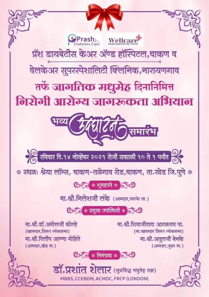 या निरोगी आरोग्य जागरुकता अभियान उदघाटन सोहळ्यास उपस्थित राहण्याचे आवाहन डॉ. प्रशांत शेलार (खेड, जुन्नर, आंबेगाव तालुक्यातील सुप्रसिद्ध मधूमेह तज्ञ), डायरेक्टर-प्रॅश डायबिटीज हाॅस्पिटल, चाकण व वेलकेअर सुपरस्पेशलिटी हाॅस्पिटल, नारायणगाव यांनी केले आहे.