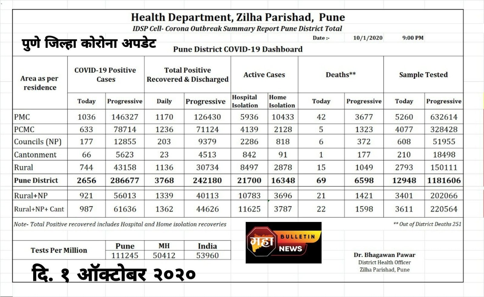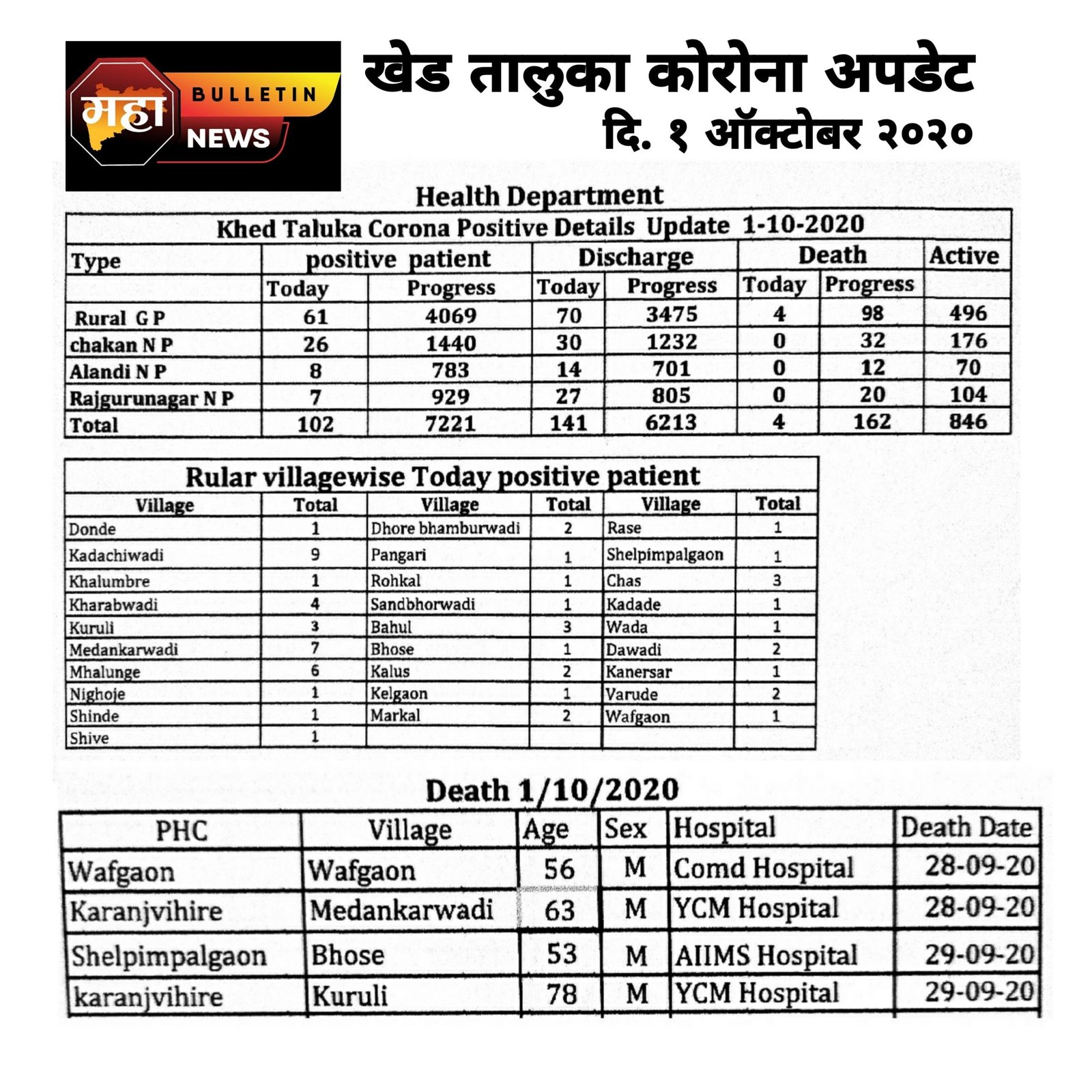 कोरोनाखेडपुणे जिल्हाविशेष महाबुलेटीन कोरोना अपडेट दि. १ ऑक्टोबर २०२० October 1, 2020 MahaBulletin Team महाबुलेटीन कोरोना अपडेट दि. १ ऑक्टोबर २०२०पुणे जिल्हा कोरोना अपडेटखेड तालुका कोरोना अपडेट