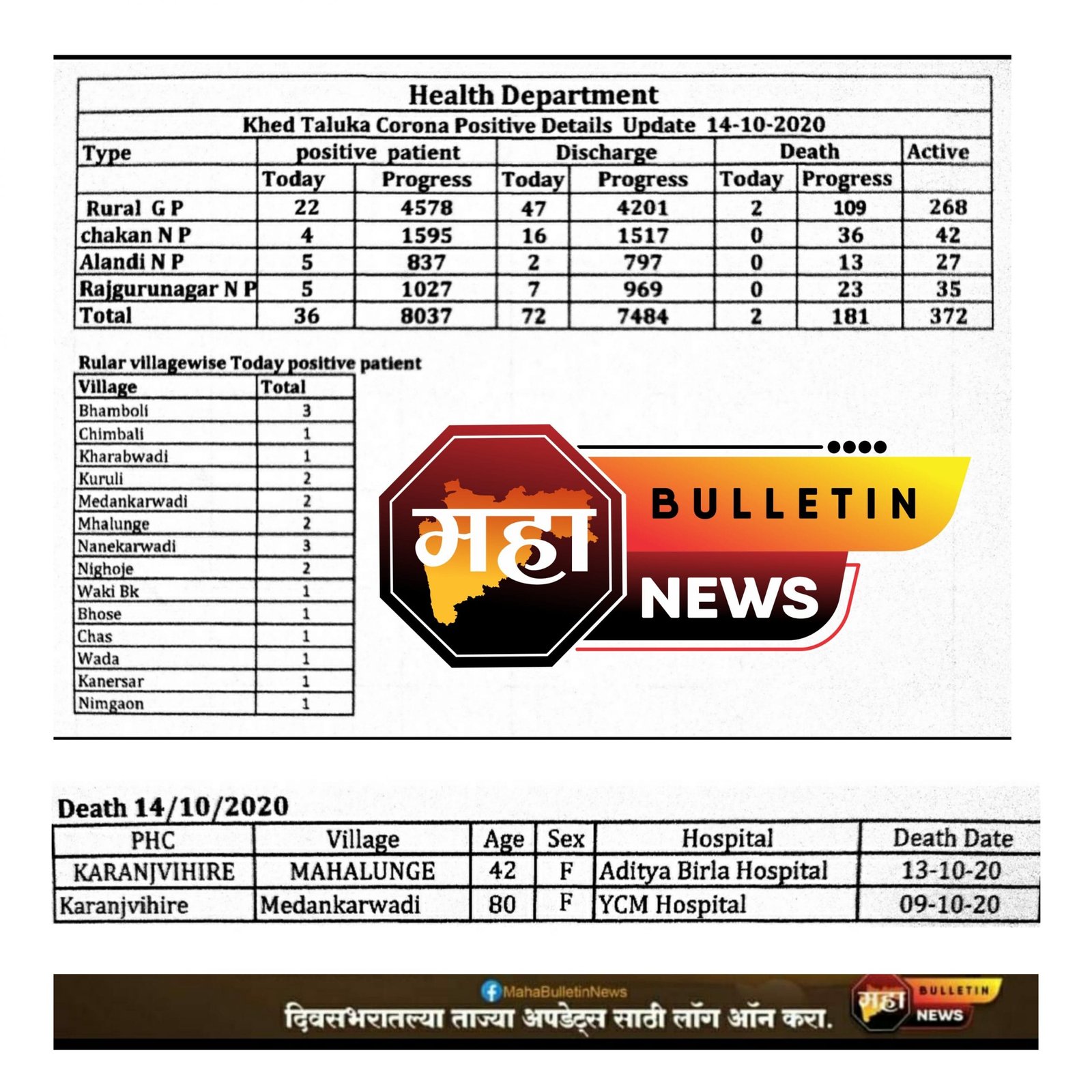 महाबुलेटीन कोरोना अपडेट : ( दि. १४ ऑक्टोबर २०२० ) खेड तालुका अपडेट – खेड तालुक्यात कोरोना रुग्णांची कालच्या संख्येत दुप्पट वाढ, आज तालुक्यात आढळले ३६ नवीन रुग्ण, दोन रुग्णांचा मृत्यू आज ७२ जणांना डिस्चार्ज..