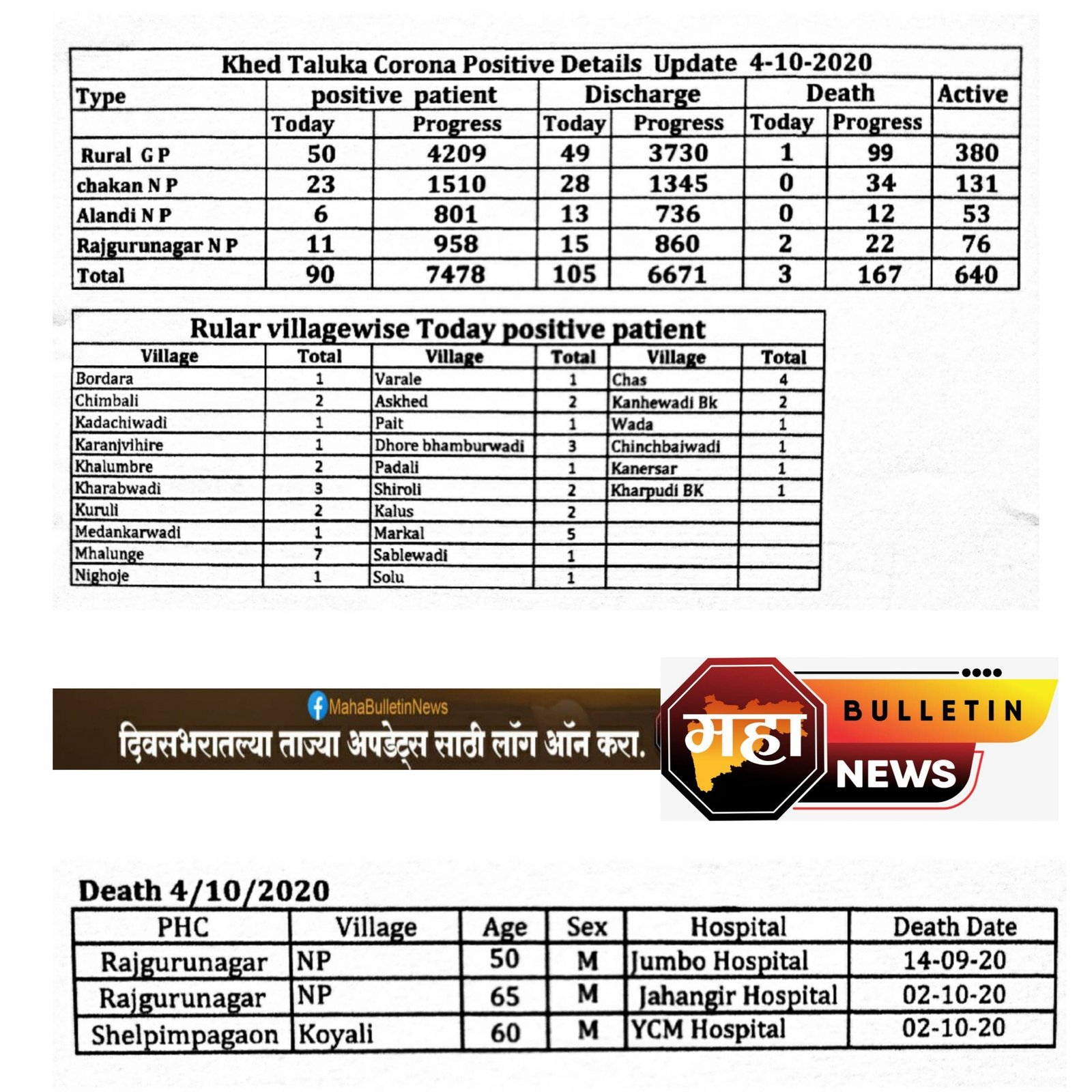 कोरोनाखेडपुणे जिल्हाविशेष महाबुलेटीन कोरोना अपडेट – खेड तालुका दि. ४ ऑक्टोबर २०२० October 4, 2020 MahaBulletin Team खेड तालुका कोरोना अपडेट ( दि. ४ ऑक्टोबर २०२० )आज खेड तालुक्यात ९० नवीन रुग्ण, चाकणला सर्वाधिक २३ रुग्ण