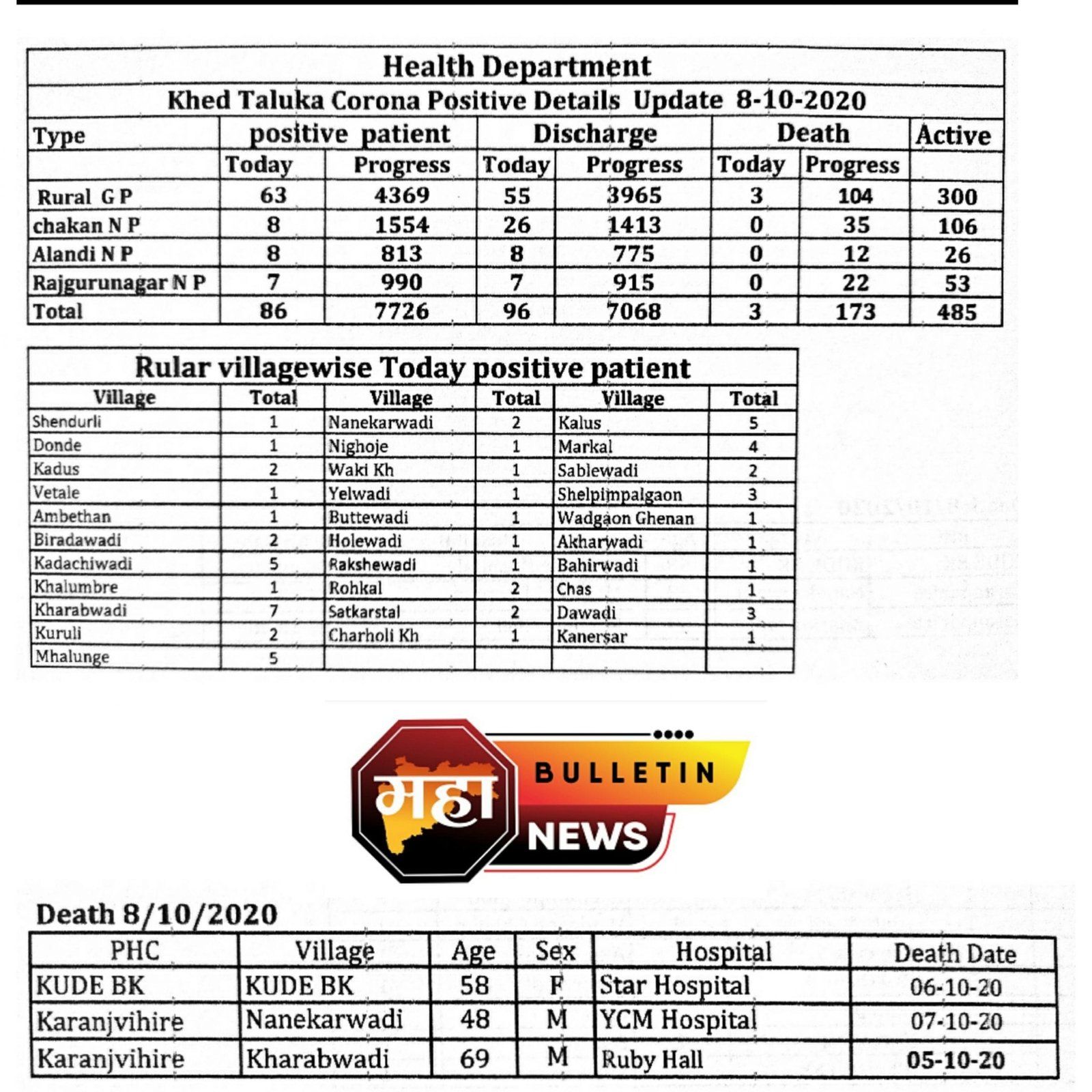 कोरोनाखेडपुणे जिल्हाविशेष महाबुलेटीन कोरोना अपडेट ( दि. ८ ऑक्टोबर २०२० ) October 8, 2020 MahaBulletin Team खेड तालुका कोरोना अपडेट खेड तालुक्यात आज ८६ नवीन रुग्णांची वाढ, ग्रामीण भागात सर्वाधिक ६३ रुग्ण, तीन जणांचा मृत्यू