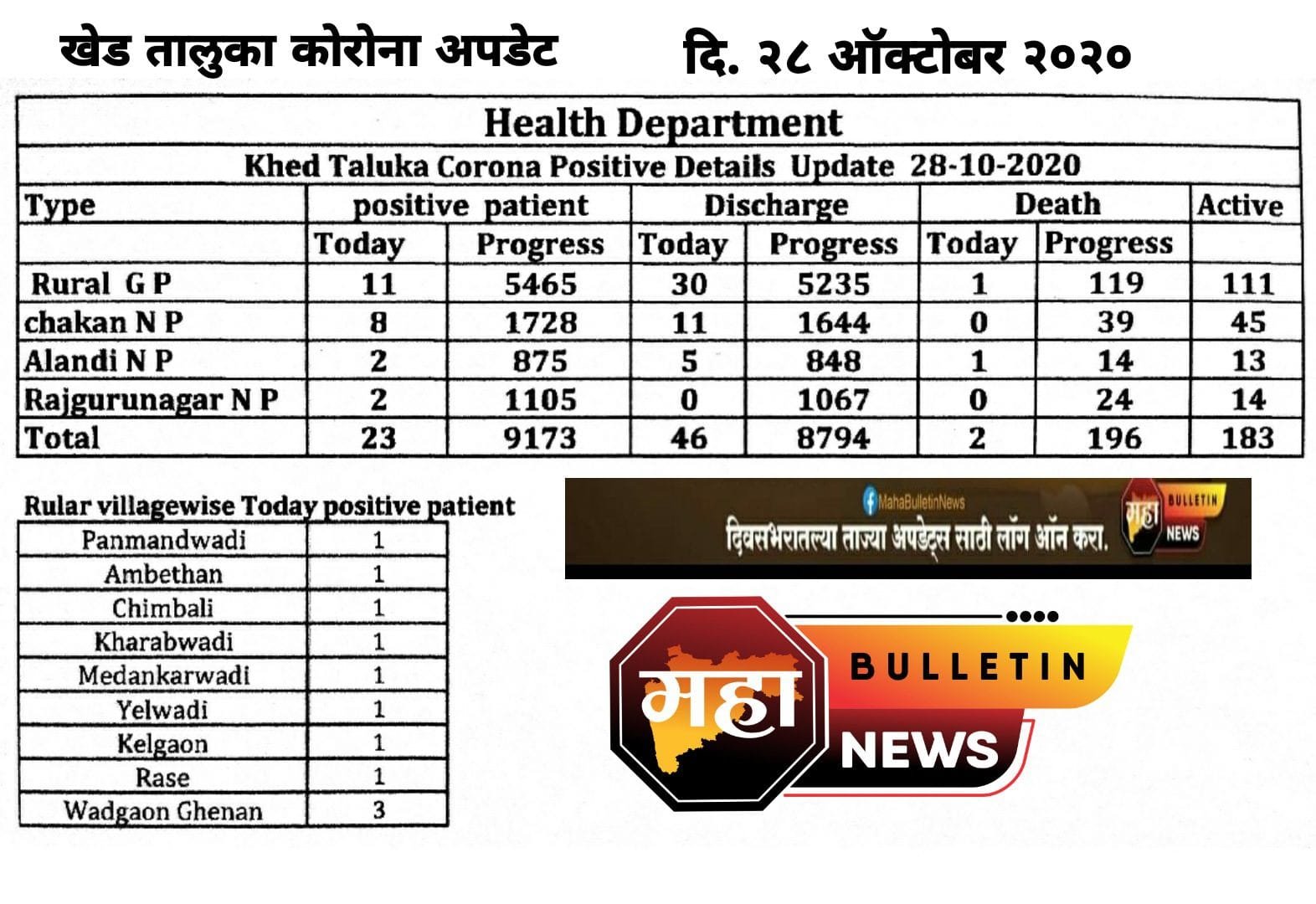 महाबुलेटीन कोरोना अपडेट : खेड तालुका अपडेट ( दि.२८ ऑक्टोबर २०२० ) खेड तालुक्यामध्ये २३ नवीन कोरोना रुग्ण आढळले, दोघांचा मृत्यू, चाकणला आढळले सर्वाधिक ८ रुग्ण…