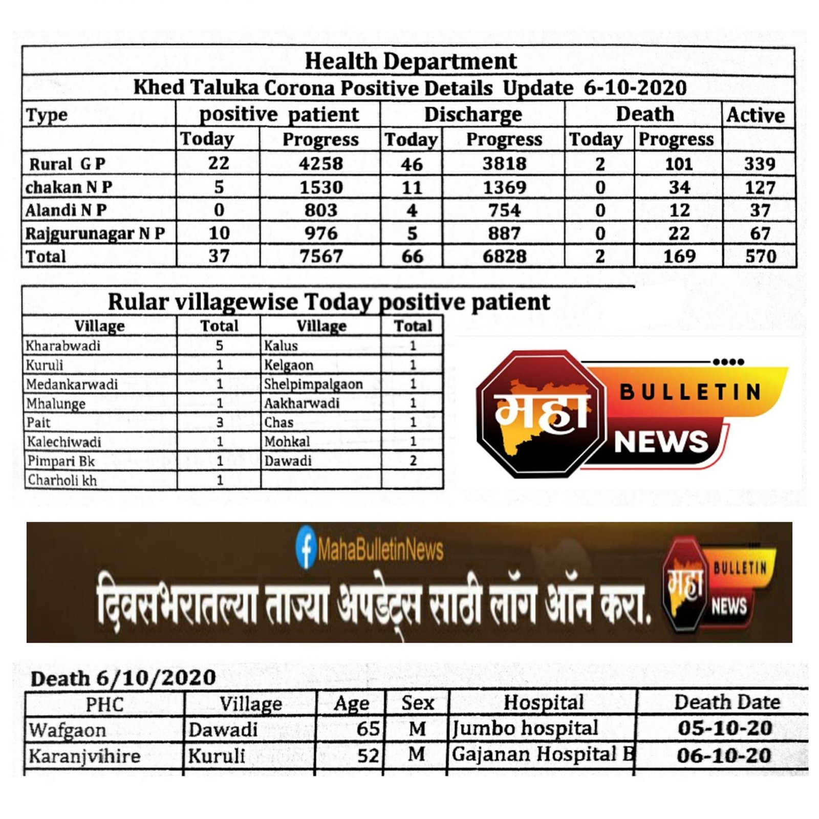 महाबुलेटीन कोरोना अपडेट खेड तालुका कोरोना अपडेट ( दि. ६ ऑक्टोबर २०२० ) दिलासादायक : आज खेड तालुक्यात कोरोना रुग्णांची संख्या घटली, तालुक्यात ३७ रुग्ण आढळले, दावडी व कुरुळी येथील दोघांचा मृत्यू