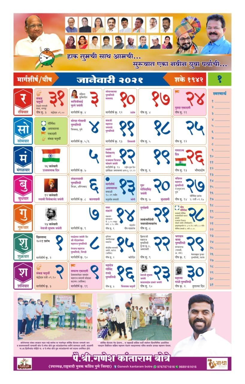 चाकण : राष्ट्रवादी युवक काँग्रेस पुणे जिल्हा उपाध्यक्ष व खेड तालुका कुस्तगीर महा संघाचे उपाध्यक्ष पै. गणेश कांताराम बोत्रे यांच्या दिनदर्शिका 2021 चे प्रकाशन आमदार श्री. दिलीपशेठ मोहिते पाटील यांच्या हस्ते व खेड तालुका राष्ट्रवादी युवक काँग्रेस पुणे जिल्हा उपाध्यक्ष व पै. गणेश बोत्रे युथ फाऊंडेशनचे उपाध्यक्ष पै. गणेश कांताराम बोत्रे यांच्या नेतृत्वाखाली संपन्न झाले.