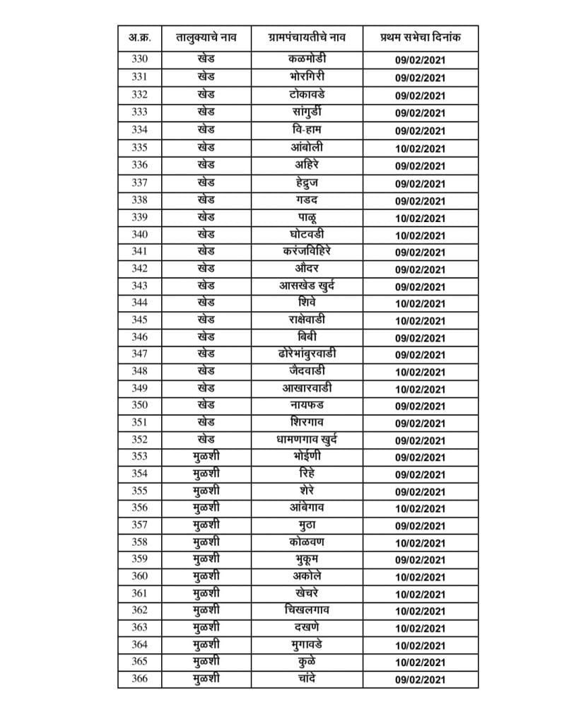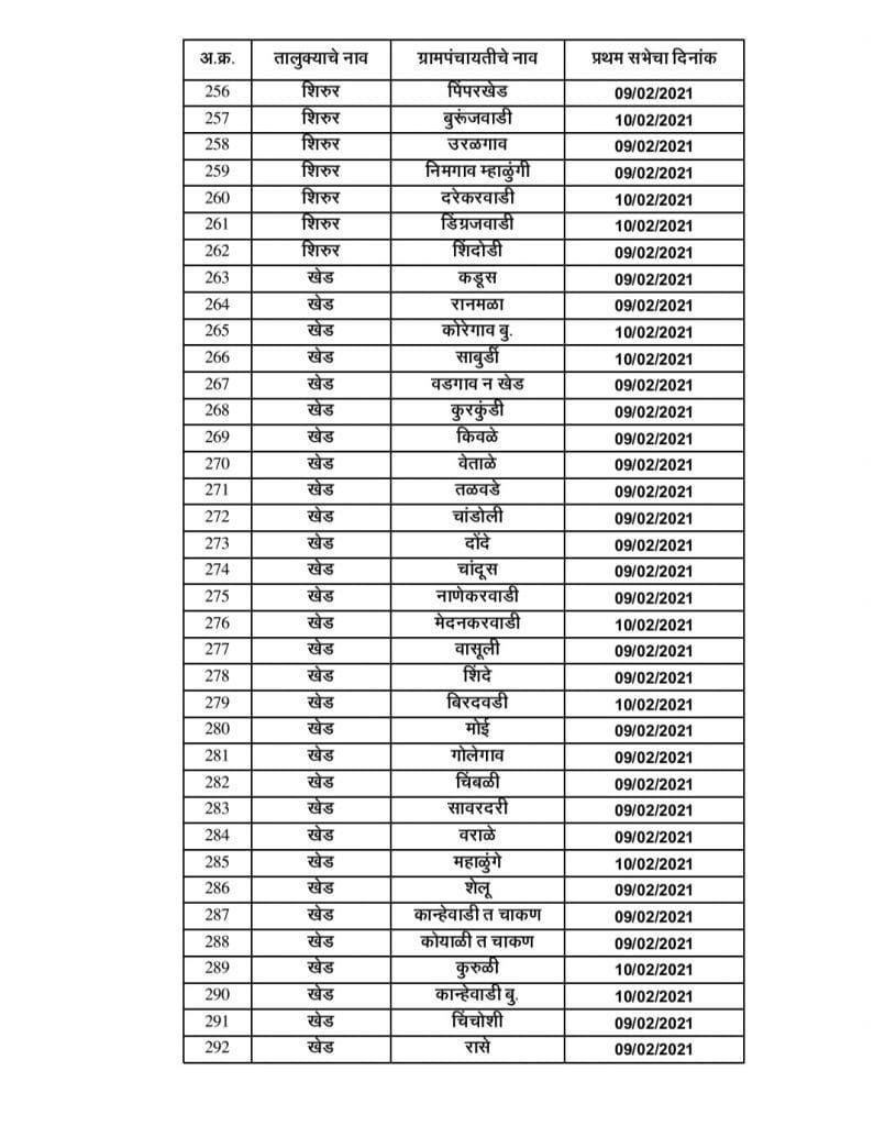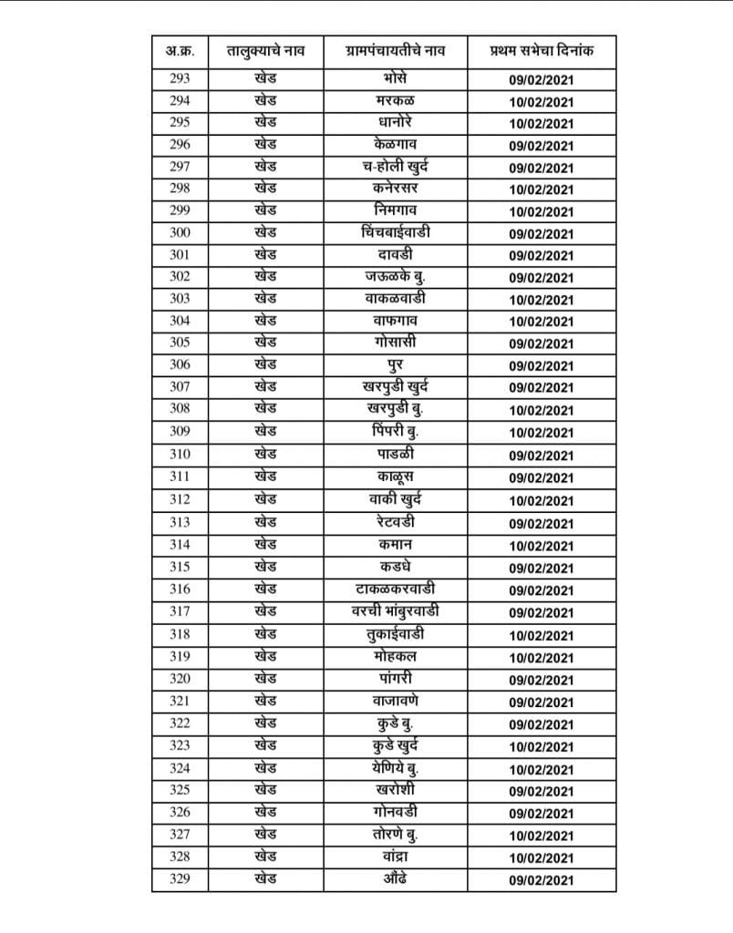 ● खेड तालुक्यातील ग्रामपंचायत सरपंच, उपसरपंच निवडणुकीच्या तारखा पुढीलप्रमाणे :-