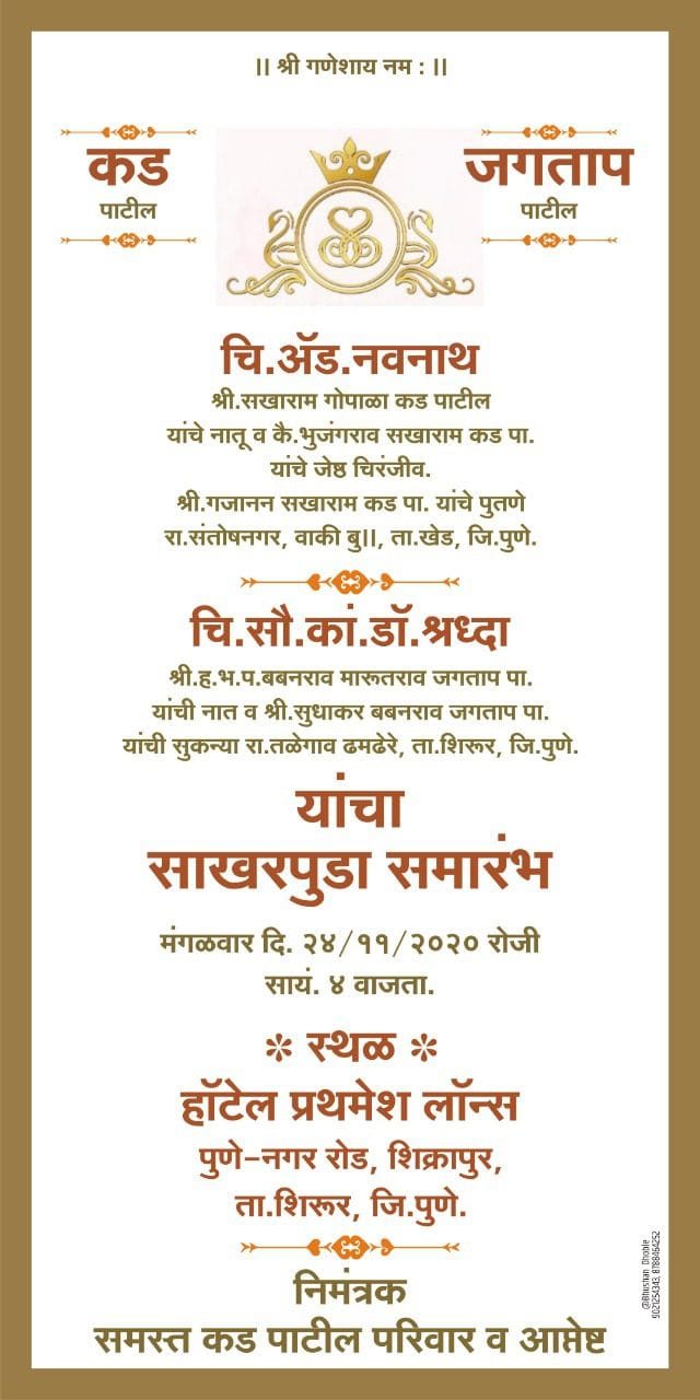 इतरखेडपुणे जिल्हाविशेषशिरूरसस्नेह निमंत्रण सस्नेह निमंत्रण : साखरपुडा समारंभ – कड पाटील 💝 जगताप पाटील November 24, 2020 MahaBulletin Team