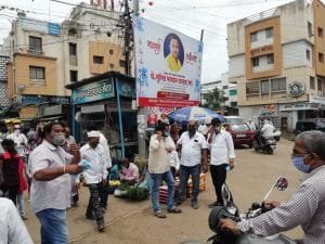नारायणगाव : श्री गणेशोत्सवास आज सर्वत्र उत्साहात प्रारंभ झाला आहे. श्रीं’चे स्वागत करण्यासाठी नागरिकांनी उत्साहाच्या भरात गावामध्ये मोठी गर्दी केली आहे. असे असताना श्री गणेशाची मूर्ती वाजत गाजत घरी नेण्यासाठी व पुजेचे साहित्य खरेदी करण्यासाठी श्री गणेशभक्त, भाविक व नागरिकांनी आज नारायणगावात मोठी गर्दी केली होती. यामुळे सोशल डिस्टंसिंग चा फज्जा उडाला. या अनुषंगाने नारायणगावचे लोकनियुक्त सरपंच योगेश पाटे यांनी गांधीगिरी करत ज्या नागरिकांनी मास्क घातले नाही, त्यांना स्व खर्चाने स्वतः मास्क घातले.