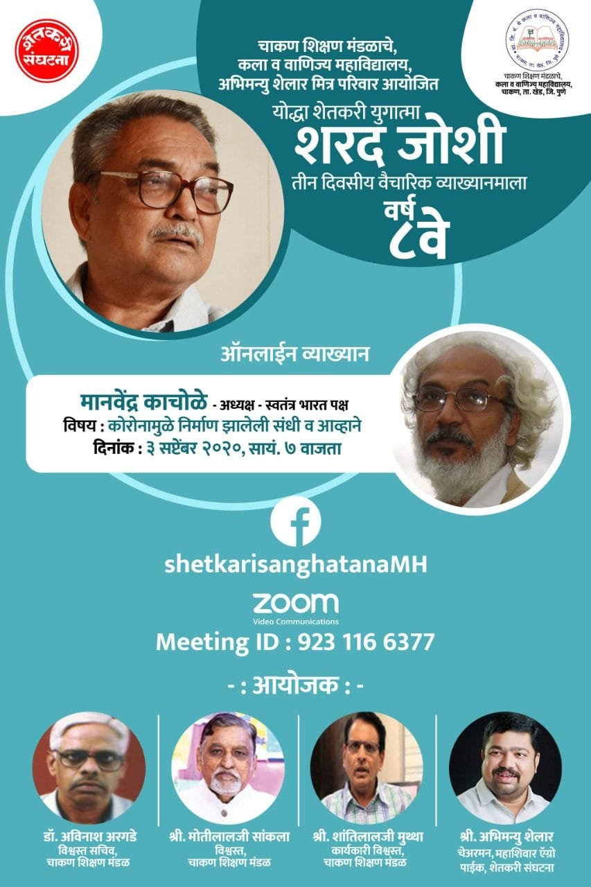 चाकण : शेतकरी संघटनेचे आणि चाकण शिक्षण मंडळाचे संस्थापक श्री शरद जोशी यांच्या जन्म दिना निमित्त ०३ सप्टेंबर २०२० रोजी चाकण शिक्षण मंडळाचे कला वाणिज्य महाविद्यालय आणि अभिमन्यु शेलार व मित्र परिवार यांनी एकत्रितपणे ‘ योद्धा शेतकरी युगात्मा शरद जोशी तीन दिवसीय वैचारिक व्याख्यानमाला’ आयोजित केली आहे.