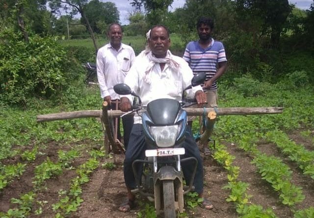 बैल नसल्याने शेतकर्याने दुचाकीला जोडले कोळपे