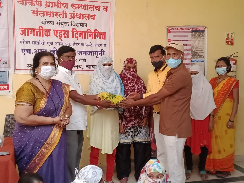नाणेकरवाडी ( ता. खेड ) येथील संतभारती ग्रंथालयाच्या वतीने एड्स सप्ताह निमित्त गरोदर मातांची एचआयव्ही चाचणी करून गरोदर मातांना फळे वाटप तसेच गरजू महिलांना मास्क व सॅनिटायझरचे वाटप करण्यात आले.